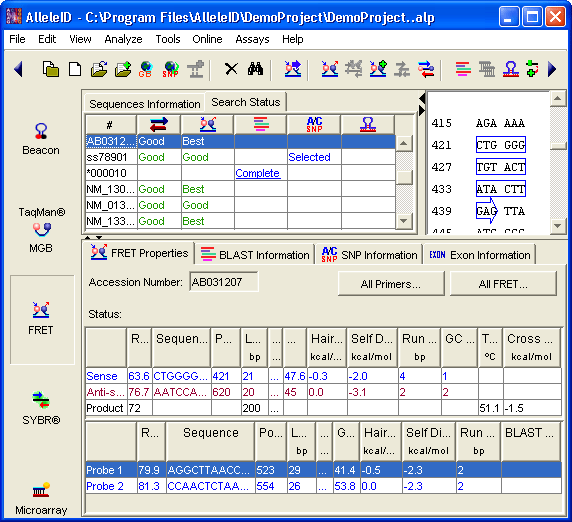 Highly specific oligos are designed by avoiding regions of significant homologies found by automatically interpreting BLAST search results. Real time PCR primer & probe efficiency is enhanced by avoiding template secondary structures. "Minimal Set", one of the most innovative features in the program, helps design the fewest number of allele specific oligonucleotide primers and dual labeled probes that uniquely identify each of the desired species/strain/taxa from the mix, lowering assay costs. For taxa or cross species assays, this feature is especially useful when the group or taxa is highly dissimilar. For a partial set of pre-designed, proven set of primers, AlleleID® can design compatible primers and probes for the rest of sequences for species identification or taxa specific assays.